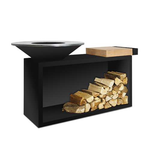 de 85 cm ou 100 cm de diamètre, une vasque, un grand socle pour le stockage des bûches, un solide