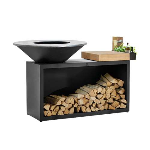 Ce produit tout-en-un combine style indétrônable et fonctionnalité. Il comprend une plaque de cuisson de 85 cm ou 100 cm de diamètre, une vasque, un grand socle pour le stockage des bûches, un solide plan de travail et un bac de rangement utile pour les ustensiles et les condiments. Le plan de travail est disponible en bois de teck ou en céramique de couleur gris anthracite.