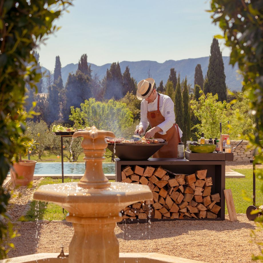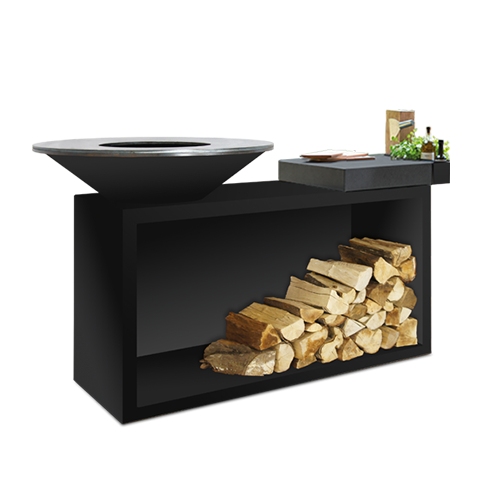 Ce produit tout-en-un combine style indétrônable et fonctionnalité. Il comprend une plaque de cuisson de 85 cm ou 100 cm de diamètre, une vasque, un grand socle pour le stockage des bûches, un solide plan de travail et un bac de rangement utile pour les ustensiles et les condiments. Le plan de travail est disponible en bois de teck ou en céramique de couleur gris anthracite.