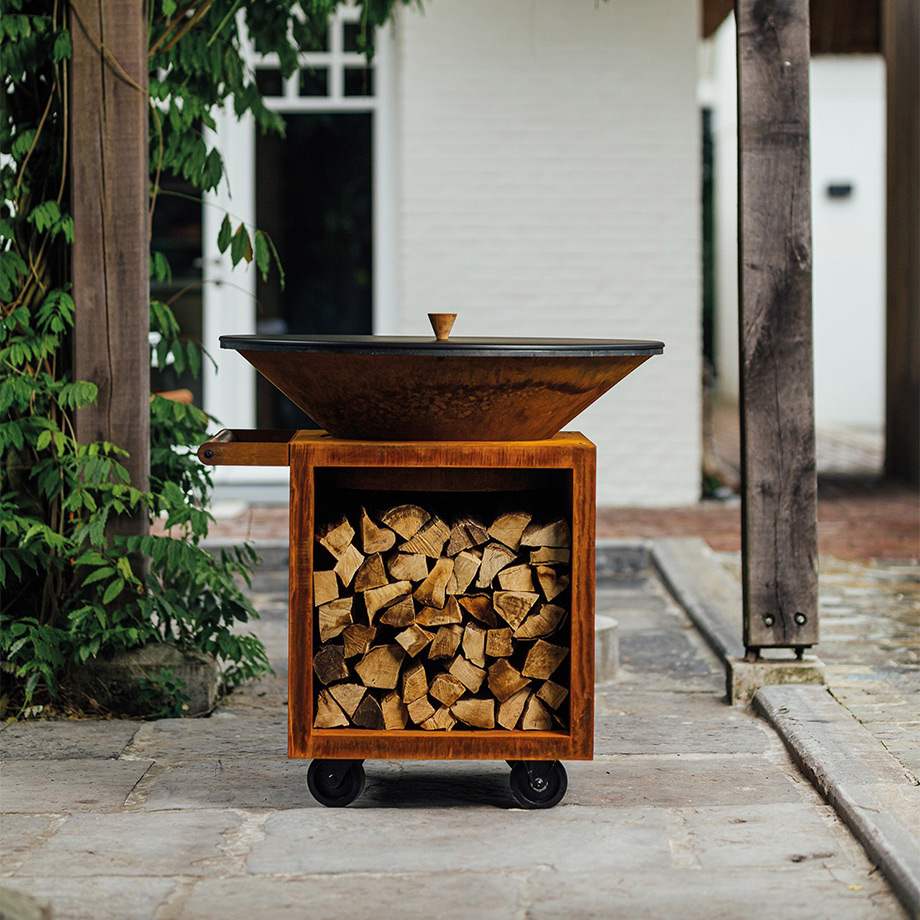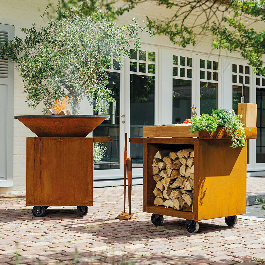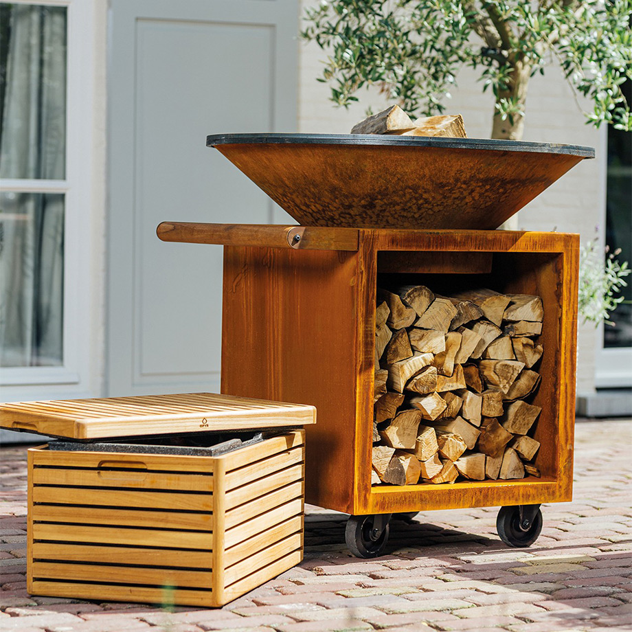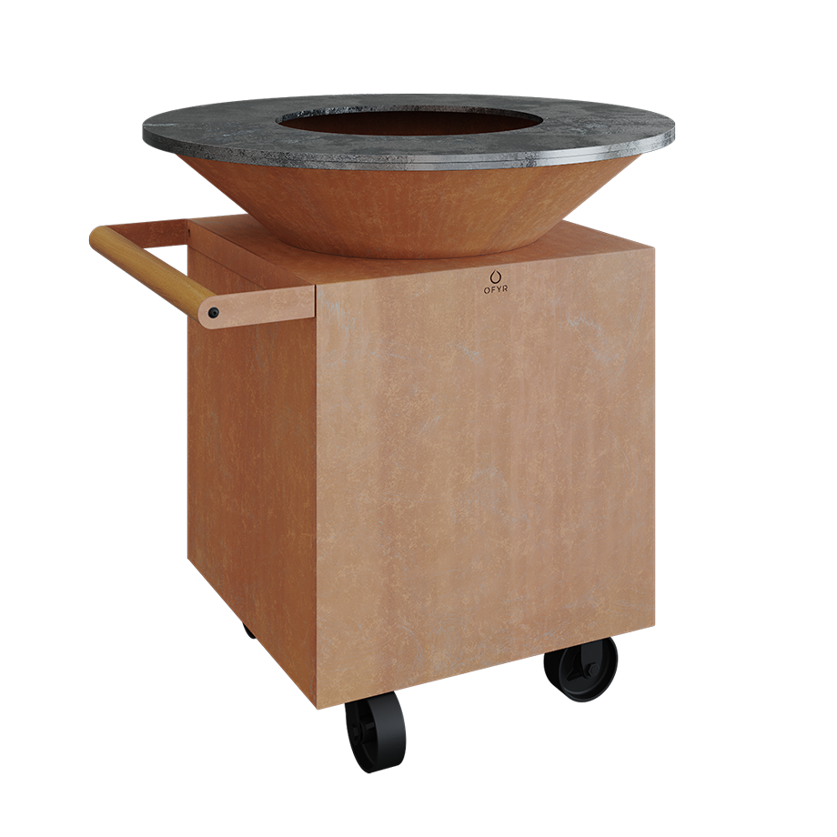 The OFYR Classic 100 PRO has all the characteristics of the OFYR Classic with the added convenience of a handle and wheels. You can easily move your cooking unit around. The handle is made from teak wood, so it is advisable to store the OFYR Classic 100 PRO inside or under a roof. Its available in 100 cm, in Corten or black-coated steel.