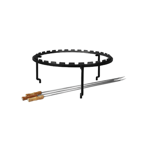 Ce set est idéal pour les fans de cuisson à la broche, au feu de bois. Positionnés au-dessus du feu, au centre de la vasque, le trépied surélevé et lanneau avec ses encoches sont à la hauteur parfaite pour cuire de la viande ou encore des légumes.